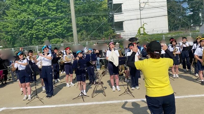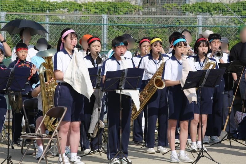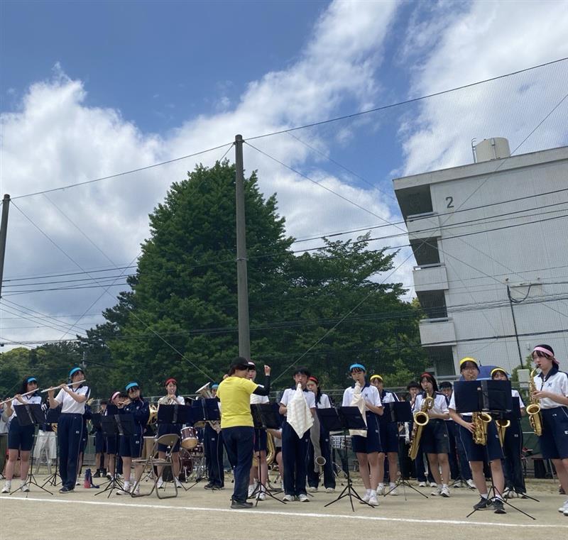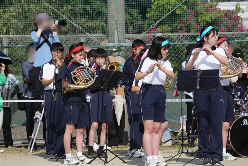 6年ぶりに中高合同で開催された運動会。吹奏楽部が開閉会式や部活動対抗リレーで入退場曲を演奏し、運動会に彩りを加えました。部員たちは緊張しつつも、本番ではアドリブも飛び出すなど、終始楽しそうに演奏していました。