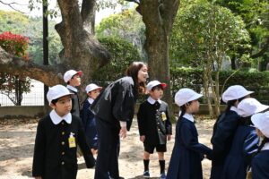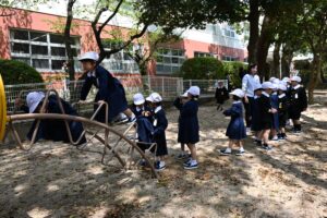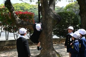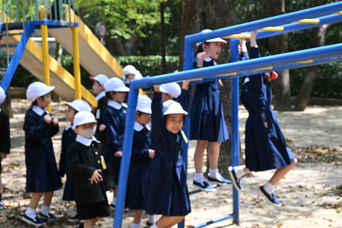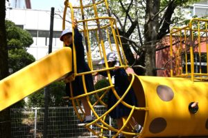 1年生も午後の授業が始まり、この日のお弁当のあとはみんなで初めて「きりんの森」で遊びました。きりんの滑り台があるので「きりんの森」と呼ばれる低学年用の遊び場です。木登り、雲梯などにもチャレンジする子どもたちもいましたが、一番人気はやはり「きりんの滑り台」でした。入学から1週間たち、お話できたり、遊ぶときに誘ったりできる友達ができてきたようです。