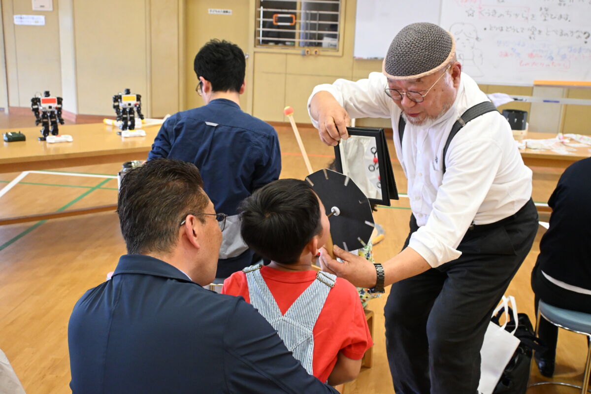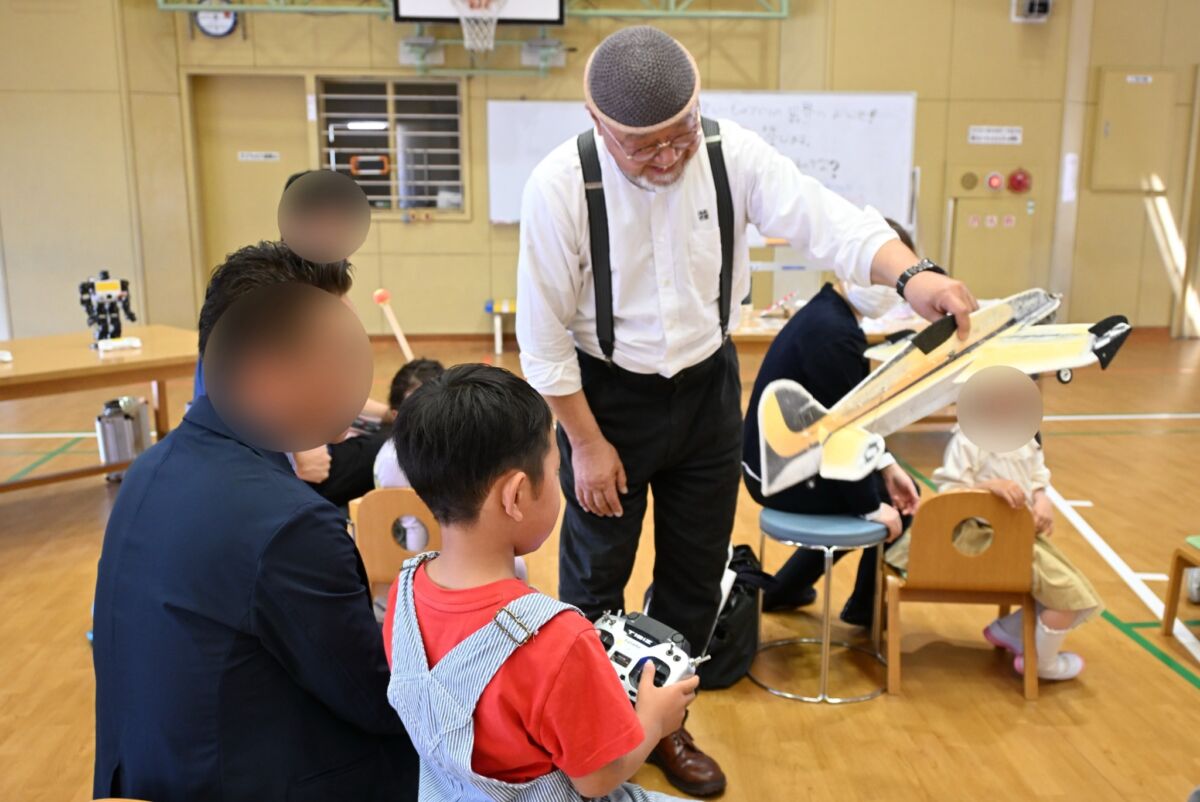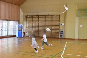 「楽しいものづくり」をテーマに、航空力学に詳しい松岡さんから「なぜ鳥は空を飛べるのか」などのお話も教えていただきました。松岡さんが持ってきてくださった手作りの楽しいおもちゃで遊んで、最後にはそれぞれに絵を描いた凧を作って、体育館で凧揚げをしました。