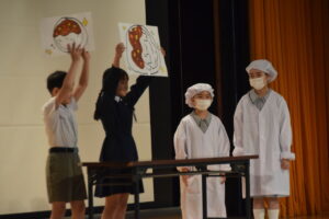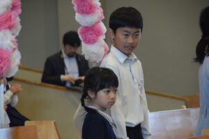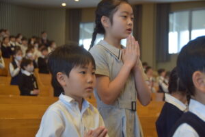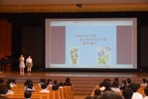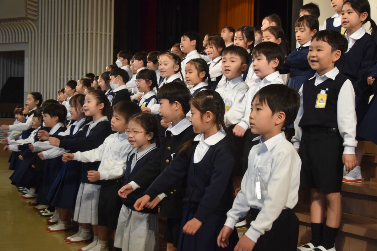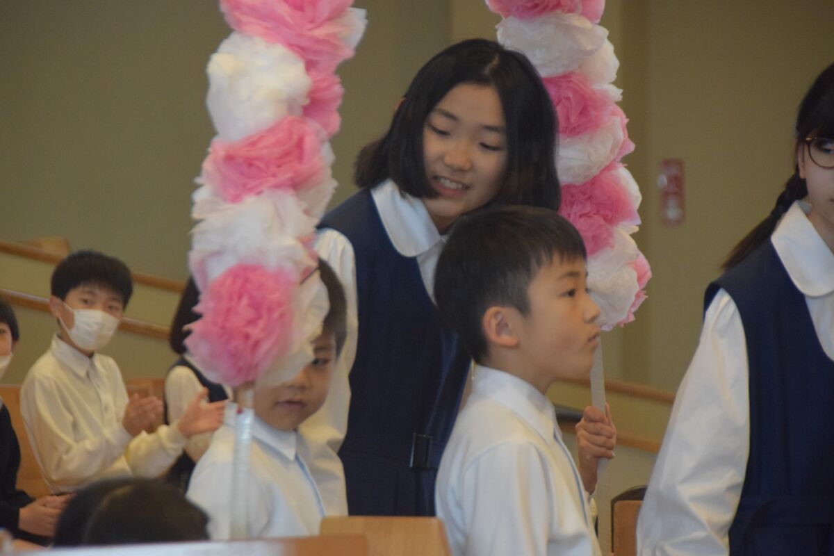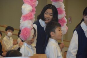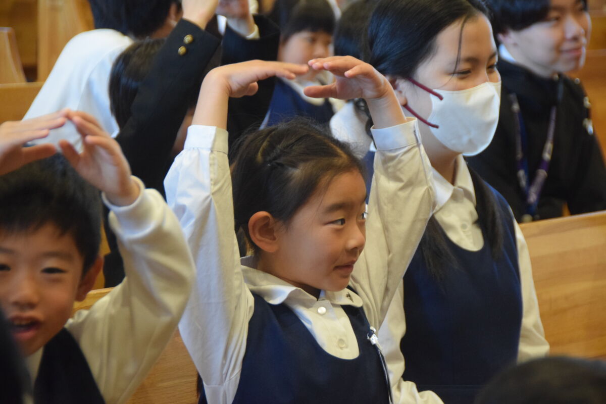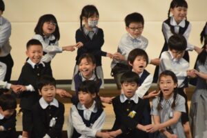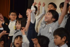 この日明治学園小学校では、講堂で1年生歓迎式を行いました。それぞれの学年ごとに歌を歌ったり、歓迎の言葉を伝えたり、明小での学校生活の〇×クイズをしたりしました。みんなの歓迎を受けた1年生は、お礼に全員で歌を歌ってくれました。