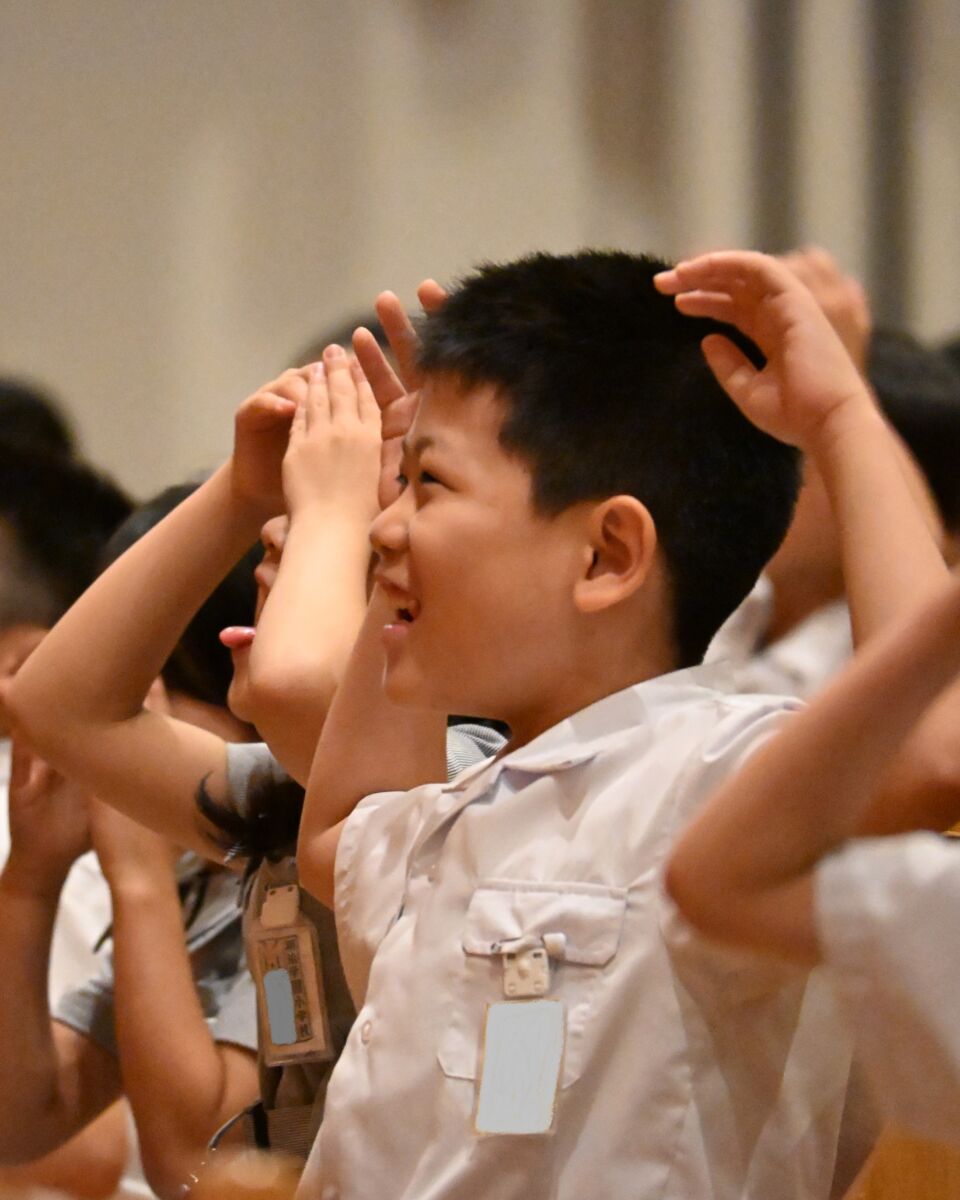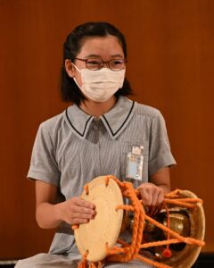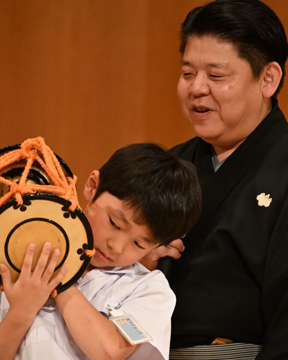 室町時代から続く長い伝統についてを学んだり、お囃子実演鑑賞に続いて、みんなで狂言の「泣く」「笑う」などの表現や笛、鼓などを体験!