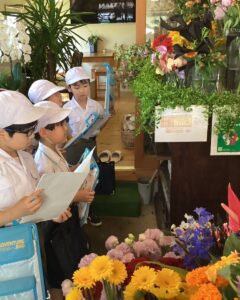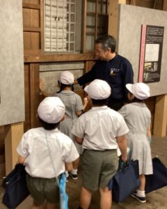 生花店、食料品店、電気店、市民センターや交番、そして旧安川邸にも。 いろいろなところに行って、自分たちで事前に考えた質問に答えていただき、それぞれのお店や施設についても詳しく教えていただくことができました。