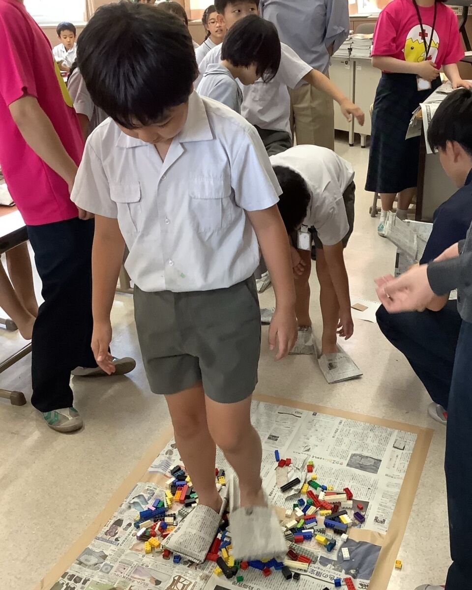 片足分1枚の新聞紙で簡単に折れるのですが、これを履いて散乱したガラスに見立てたおもちゃのブロックの上を歩いてみると、全然痛くない!みんなビックリでした。