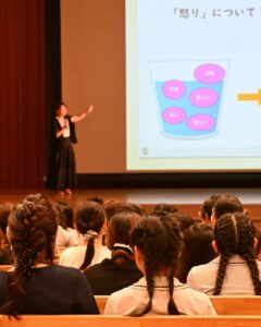 8月29日に、6年生は保護者の方々といっしょに講堂で「こころの教育」の授業を受けました。講師は福岡県警の少年サポートセンターで相談業務や立ち直り支援を行ってこられた、カウンセラーの堀井智帆先生です。