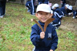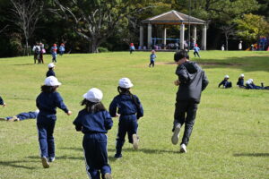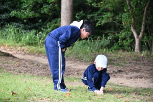 夜宮公園に着くと、さっそくキンモクセイのよい香りがしてきて、子どもたちも大喜び♪ この日は、天気も良く、近隣の幼稚園児もたくさん遊びに来ていました。どんぐりや松ぼっくりなどを拾いながら楽しく秋を感じることができました♪