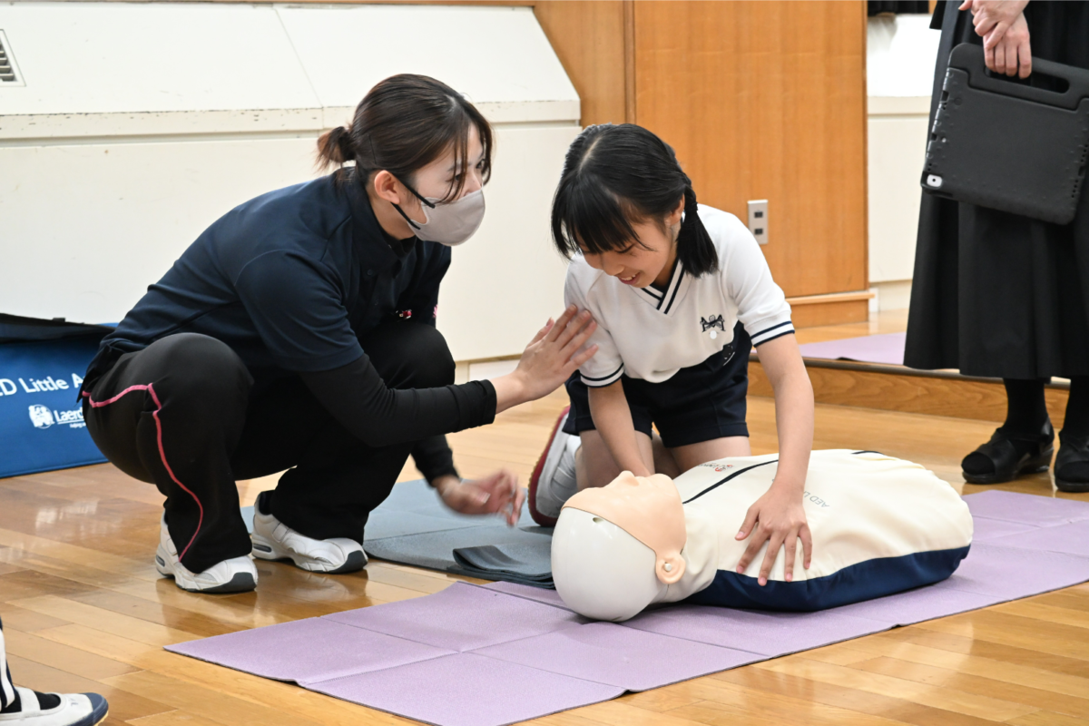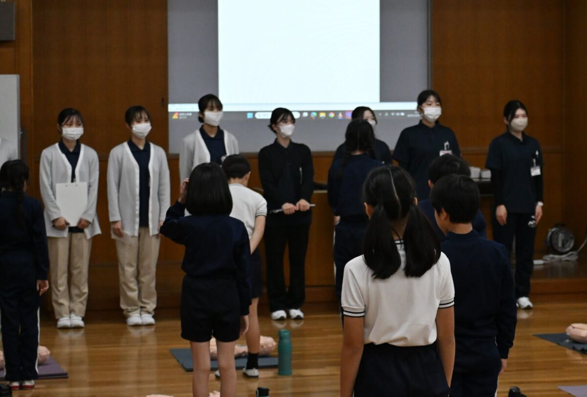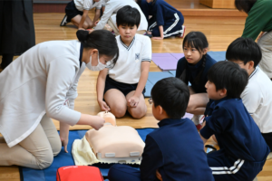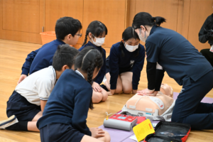 12月初旬、救急救命士や西南女学院大学保健福祉学部の学生ボランティアの皆さまのご協力を得て実施しました。事前学習では心臓の働き等の基礎知識に加え、毎年多くの人が心臓突然死で命を失っている現状や、周囲の人が胸骨圧迫を行い、AEDを使うことで、助けられる命があることを学びました。当日は、CPR・AED学習キット「ミニアン」を用いた実技指導の後、リトルアンを使ったグループ学習を行いました。倒れている人を発見してから救急車が到着するまでの救命処置の流れを、真剣に学ぶことができました。