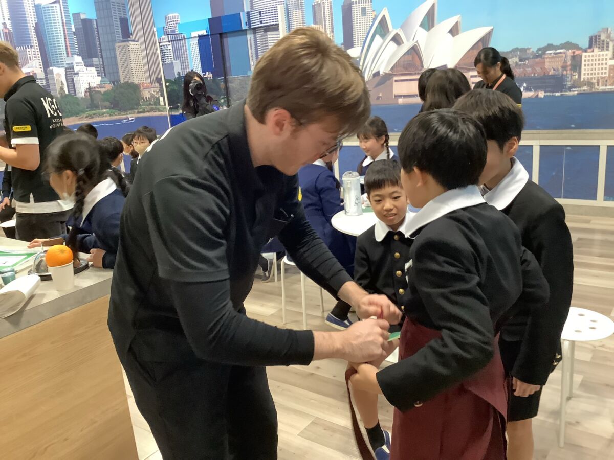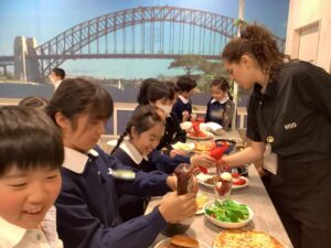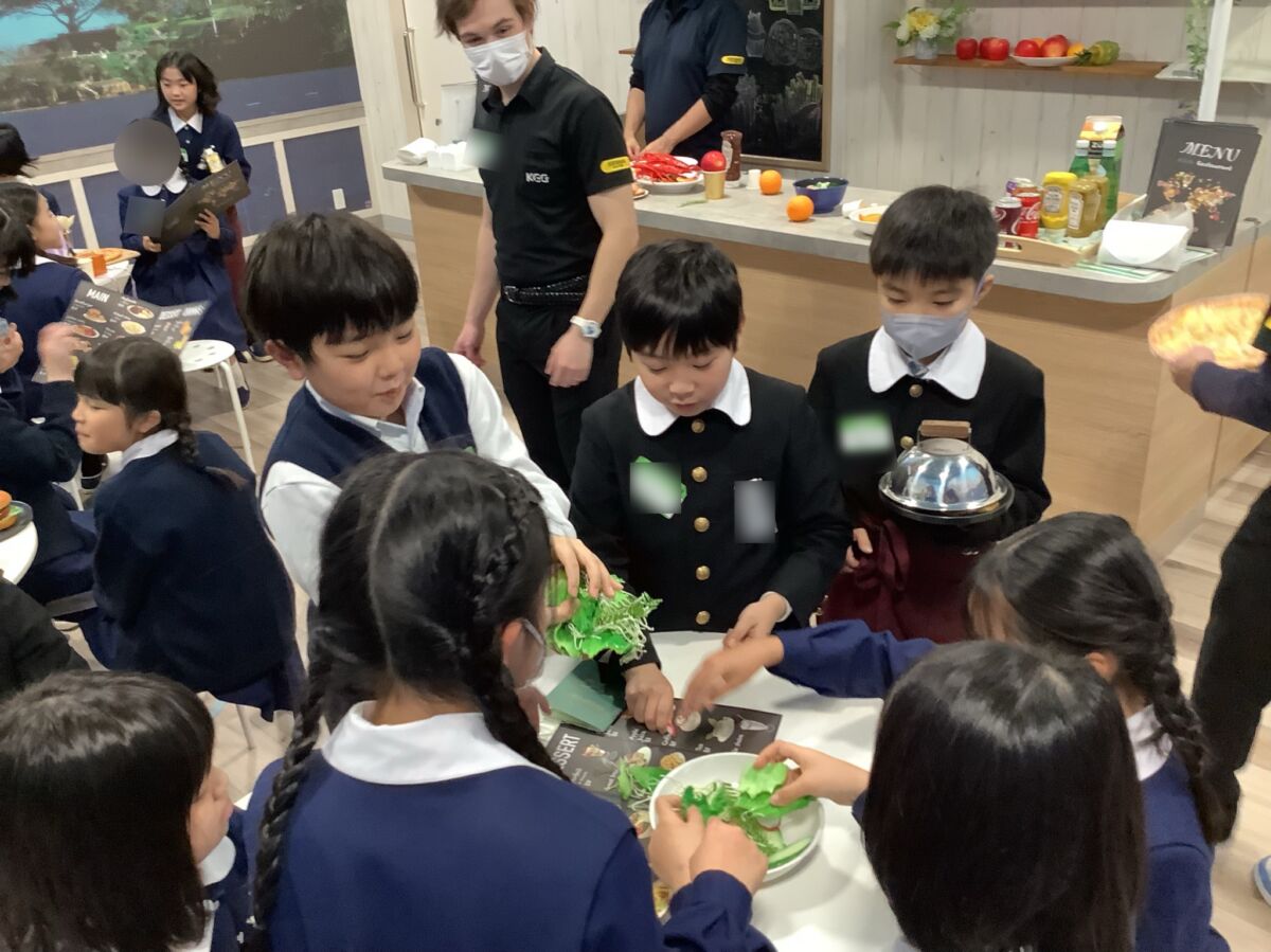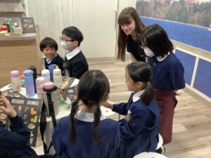 KGGではグループに分かれて、「エージェント」と呼ばれる外国人の先生といっしょにホテルやレストラン、飛行機のモックアップなどを回って、頼みたいものを英語で伝えたり、英語のゲームにチャレンジしたりして、楽しく英語の学習に取り組みました。