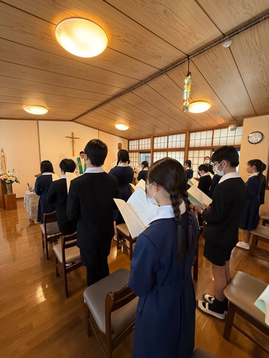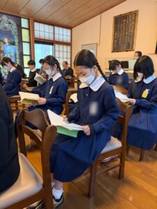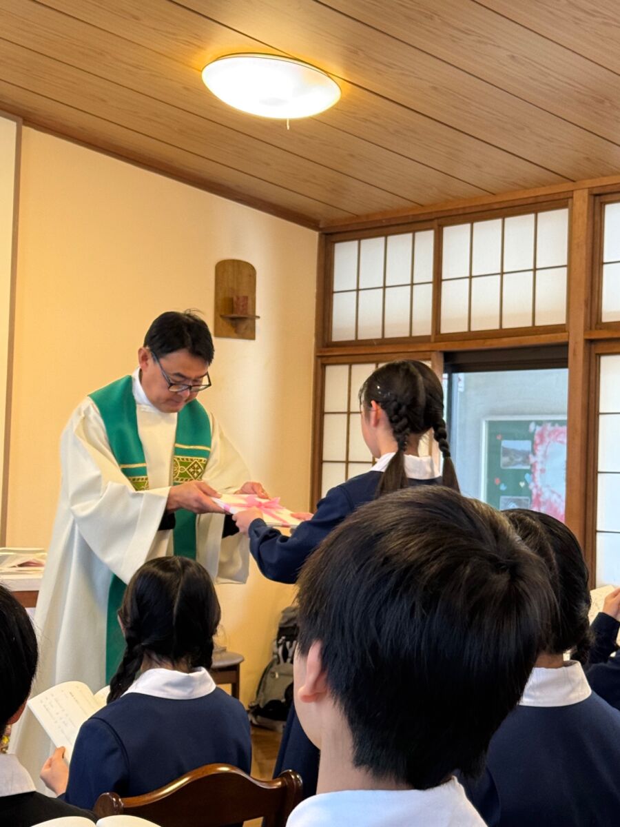 学園聖堂で行われた集いの第1部では、神父様の講話をお聞きしました。「ありがとう」の意味、そして「恵み」について深く考えることができました。