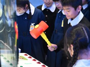 安川電機は、ロボットアームやモーター、インバーターなどの技術で広く知られています。子どもたちは、敷地内にある安川電機みらい館で、実際にロボットと対決をするなどし、楽しく見学しました。