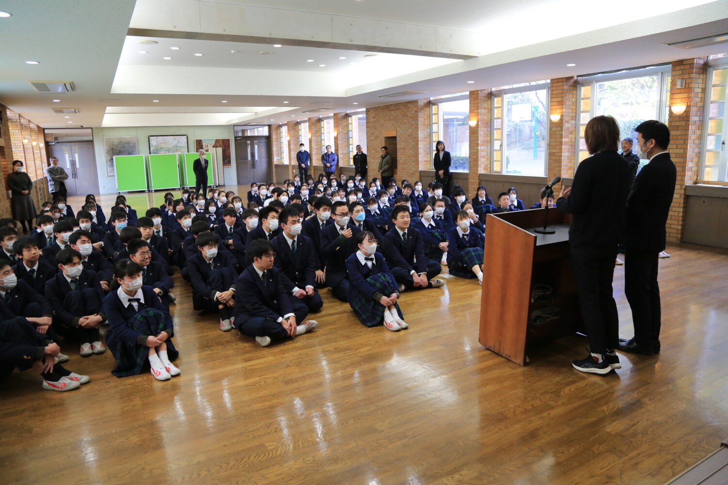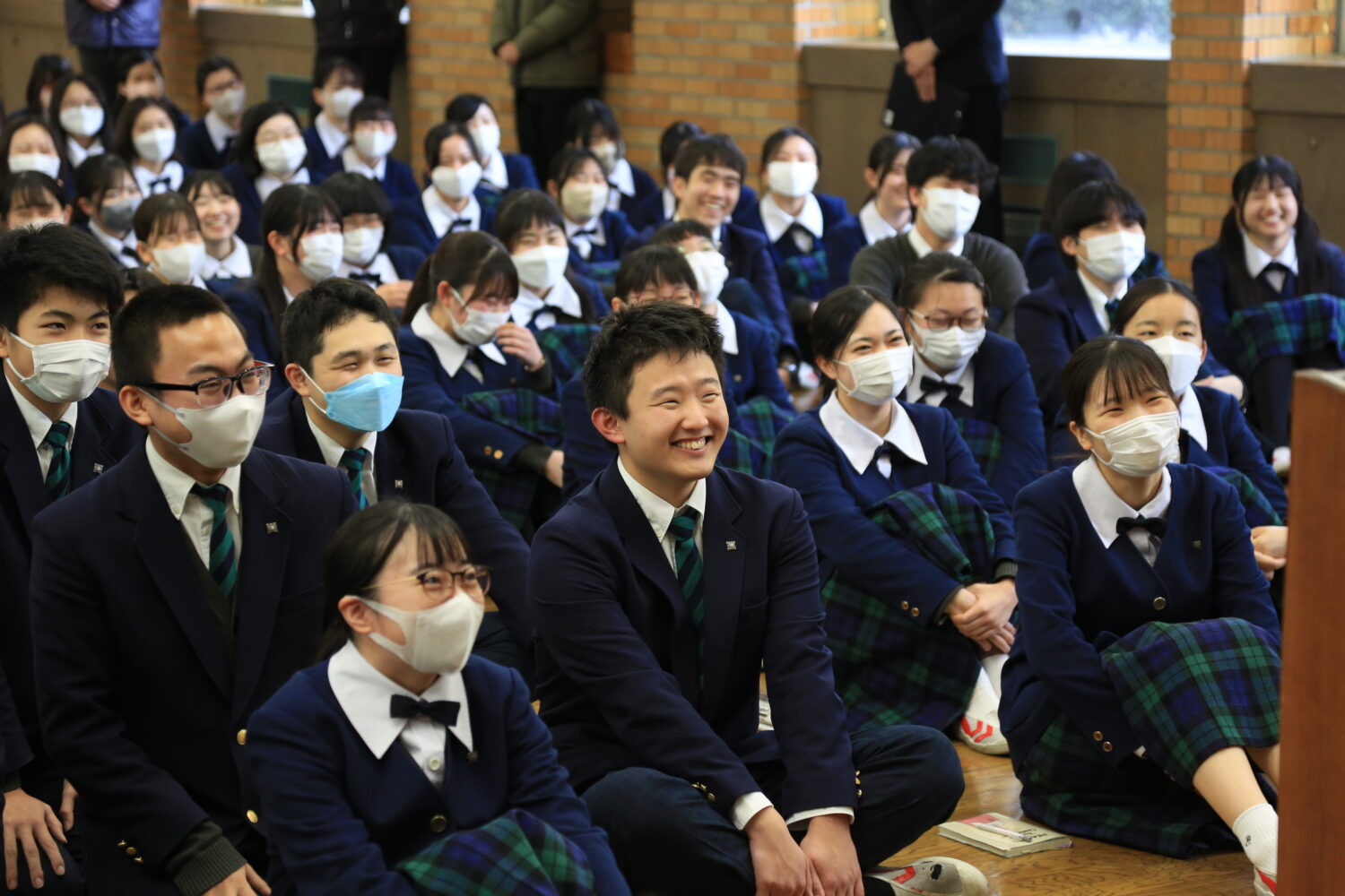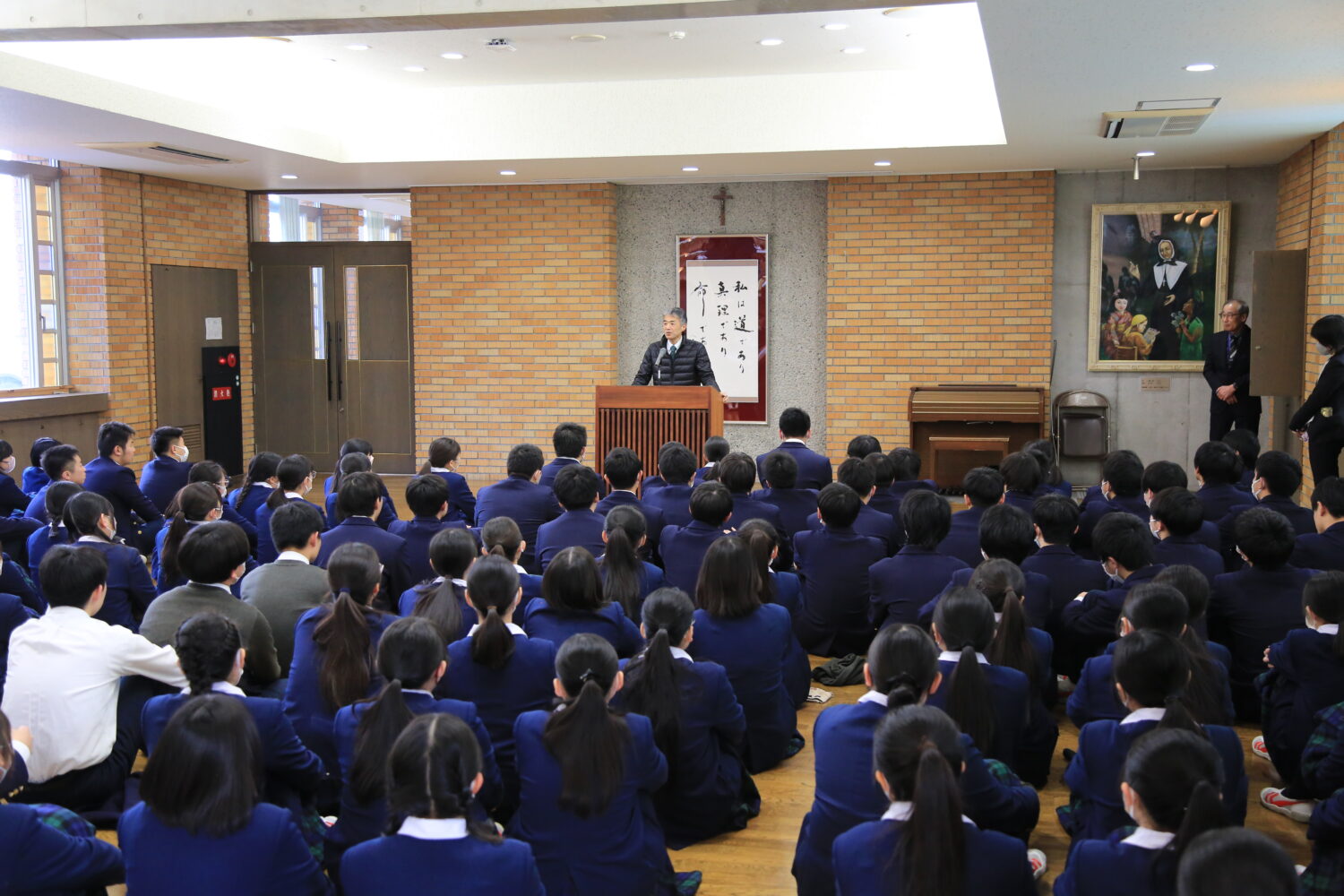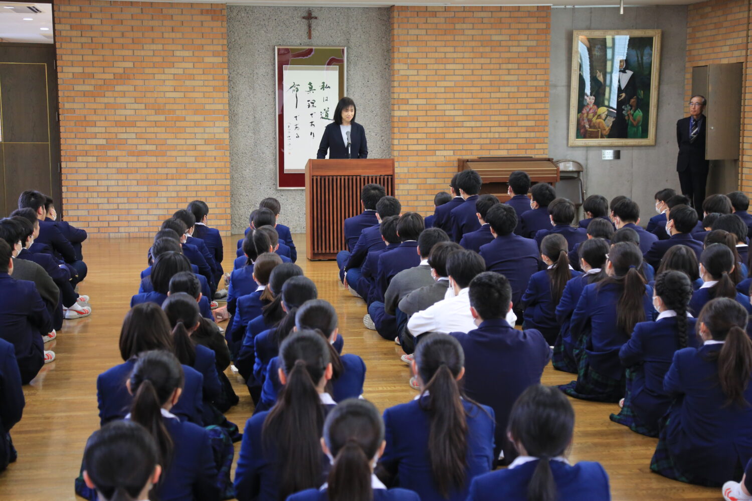 明日に共通テストを控えた1月17日(金)4時間目に、高校3年生に向けての激励会が行われました。大谷校長から「あなたの力を最大限に発揮できるように、これまでの習慣を思い出して心を落ち着かせてください。試験でベストを出せるように祈っています。」と話があり、中学時の学年主任の石松・見村先生コンビは、「やってきたことを自信に、中学校の時からことあるごとに話していた『全力で取り組む』を忘れずに取り組んでほしい」と話し、一同を元気づけました。最後に長年高校3年の受験を見守り続けてきた進路学習指導部長の井ノ森先生から、自身の受験体験話や過去の卒業生の受験の様子などが紹介され、和やかな雰囲気でありながらも気の引き締まるひと時を過ごすことができました。受験生の皆さん、中高教員一同心を合わせて健闘をお祈りしています!