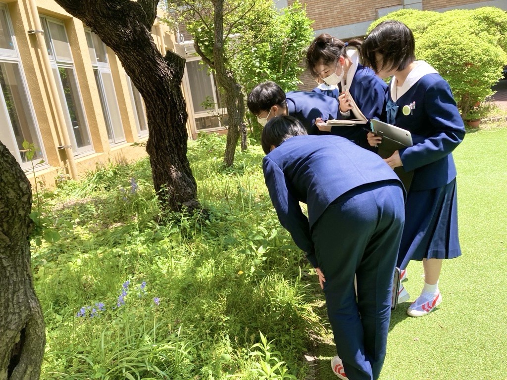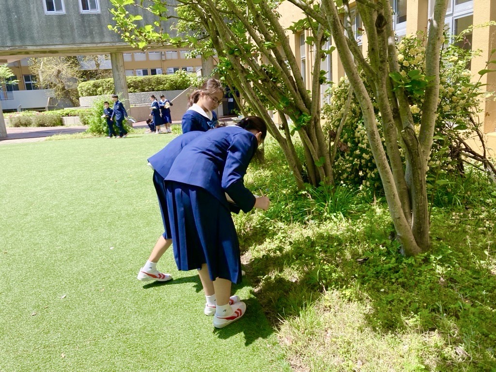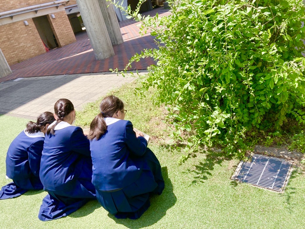 中学1年生の理科の授業で中庭の植物の観察を行いました。