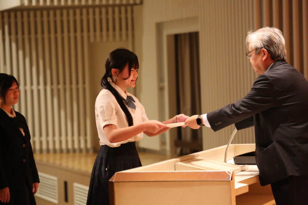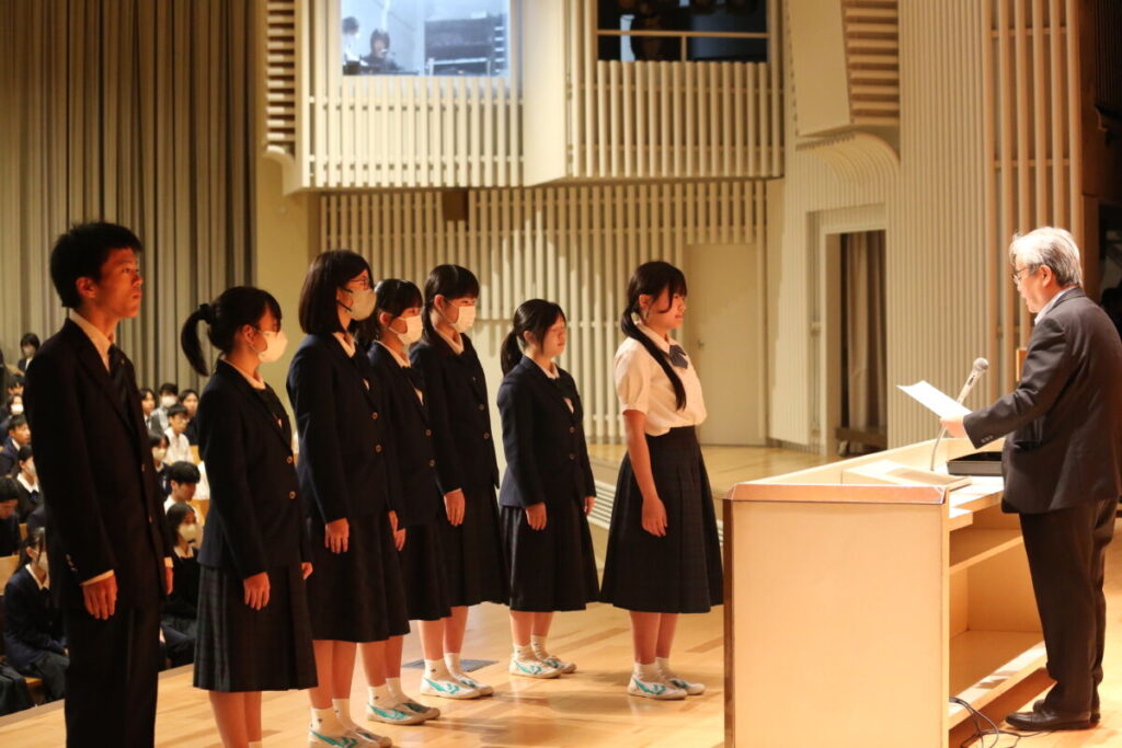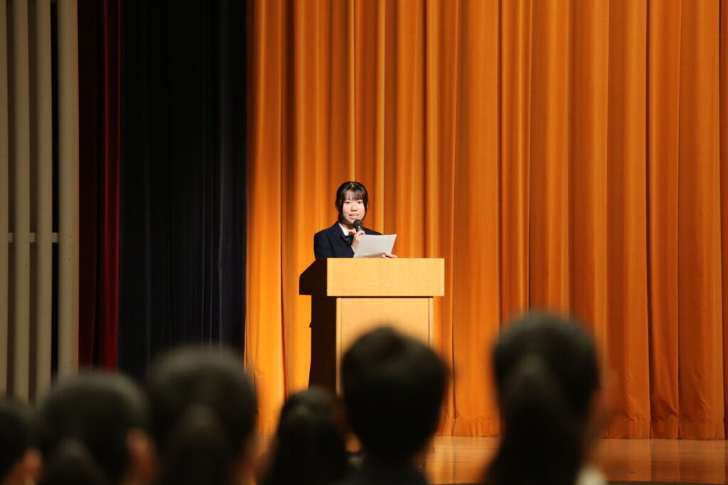 生徒会朝礼で、生徒会執行部と各委員会委員長の任命式が行われました。先日の投票で選ばれた生徒会執行部計8名の役員が顔を揃え、第61期生徒会執行部がスタートしました。また、昨年度活動した第60期生徒会執行部から、全校生徒に向けて一年間のお礼の挨拶がありました。一年間の頑張りを称え、温かい拍手が送られました。