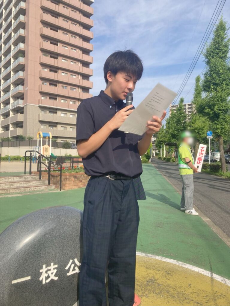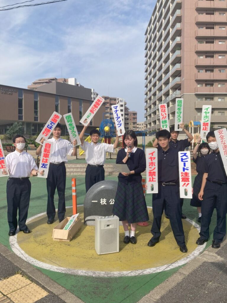 当日は、学校近くの交差点に立ち、自転車通学の生徒に向けてヘルメットの着用や一時停止の徹底など、安全運転の大切さの呼びかけを実施。 戸畑警察署の方々からは具体的な注意点やアドバイスもいただき、改めて交通ルールの重要性を実感する機会に。