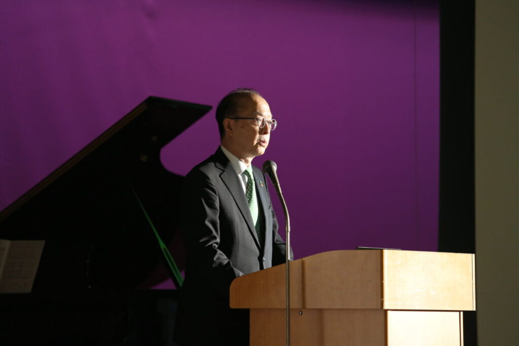 明治学園の先輩・村上周二理事長が語る、安川敬一郎氏、松本健次郎氏の生涯と明治学園の歴史についてのお話に静かに耳を傾けました。