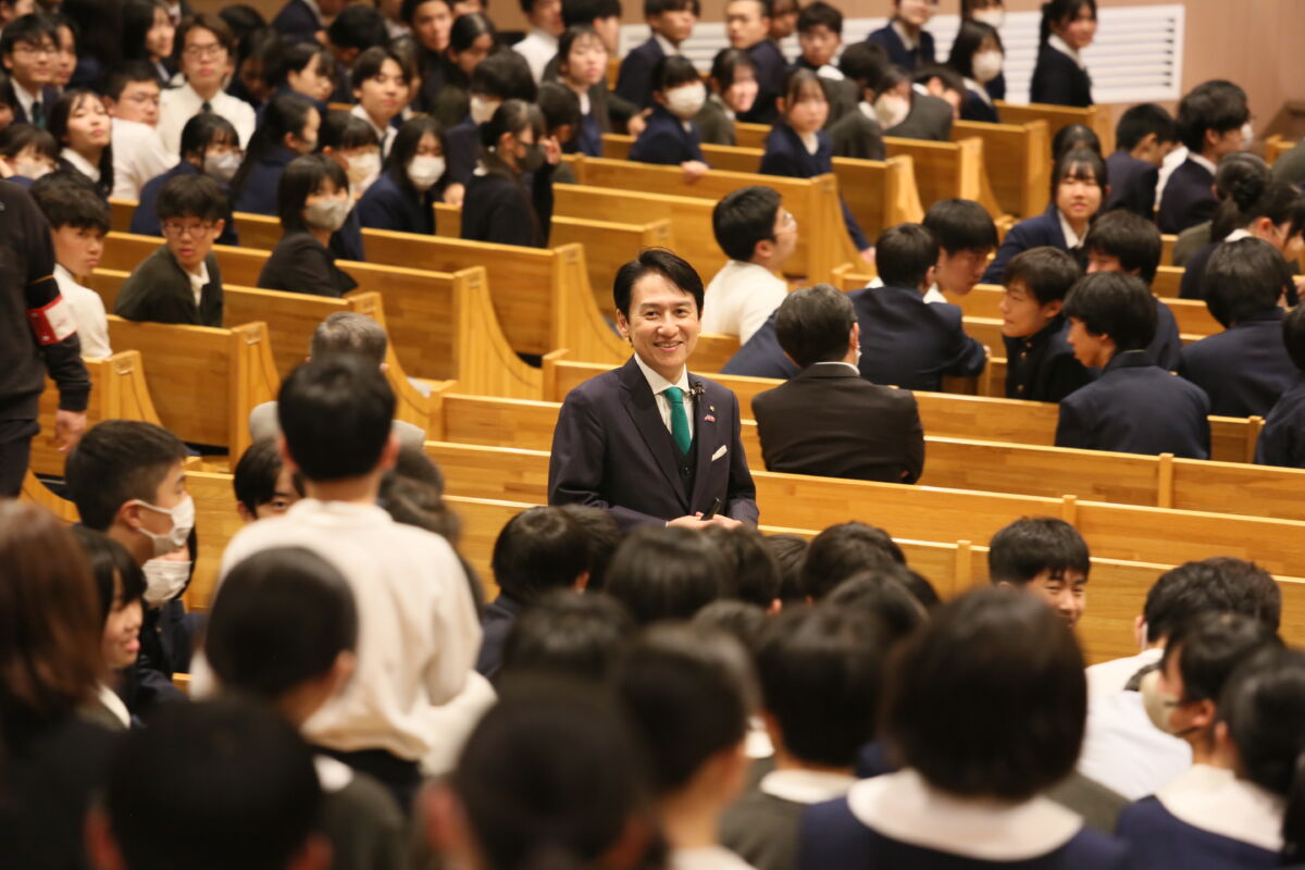 市長の問いかけに対しては、生徒も自分の思いを懸命に言葉にしていきました。市長が繰り返し伝えた「変える勇気」と「変えない軸」というメッセージは、今まさに変革期を迎えている明治学園生に深く響き、会場にいた一人ひとりが自分自身の“未来の選択”を見つめる機会となりました。