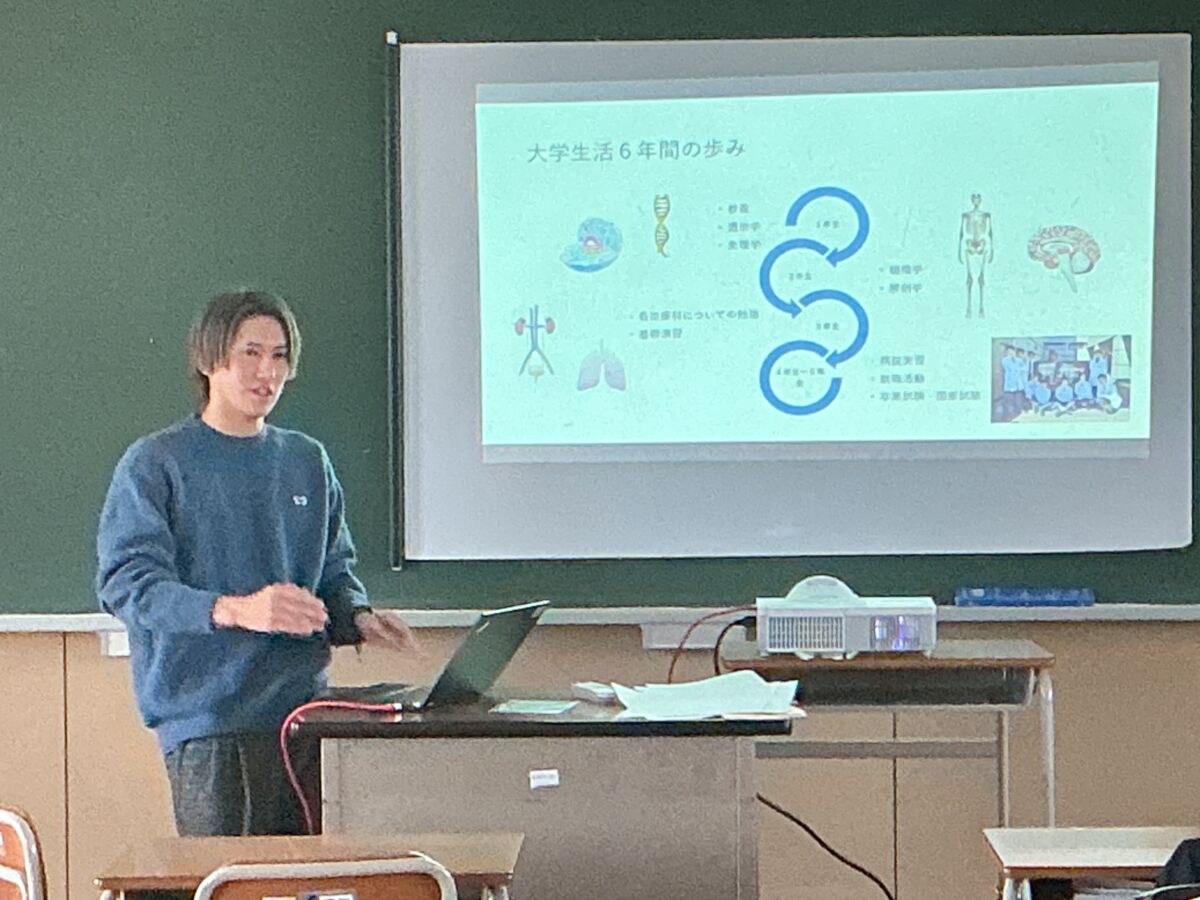 11月4日(火)、高2の医療生命倫理の授業に、卒業生で熊本大学医学部6年生在学中の松岡竜さんに講演をしていただきました。大学で学ぶ内容だけでなく、大学の部活動やアルバイト、ちょっとした裏話など、リアルな医学部生の声に生徒たちは興味津々でした。受験に向けたアドバイスや高校時代の話、明治卒業生のつながりの広さなど様々なお話をしてくださいました。また、講演後の座談会では、真面目かつ鋭い質問にたじろぐ場面もありながら、返答はさすがの見識で生徒たちをうならせてくれました。今回のお話を通して、生徒たちも今後の学びの方向性についていろいろと考える機会になったと思います。松岡さん、お忙しい中素晴らしい時間をありがとうございました!