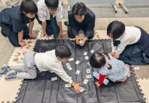生徒が用意したツールは3つでしたが、それだけでは対応できないということで急遽カードを分割し、新しいゲームを準備。防災カルタ・防災ブタのしっぽ・防災神経衰弱・防災ババ抜き・防災トーンチャイムこの5つのアクティビティで子どもたちに笑顔をもたらしました。