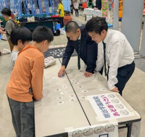 子どもたちに遊びながら防災を伝える「あそぼうさい」ブースを展開。500名近くの子どもや保護者が明治学園ブースにやってきました。