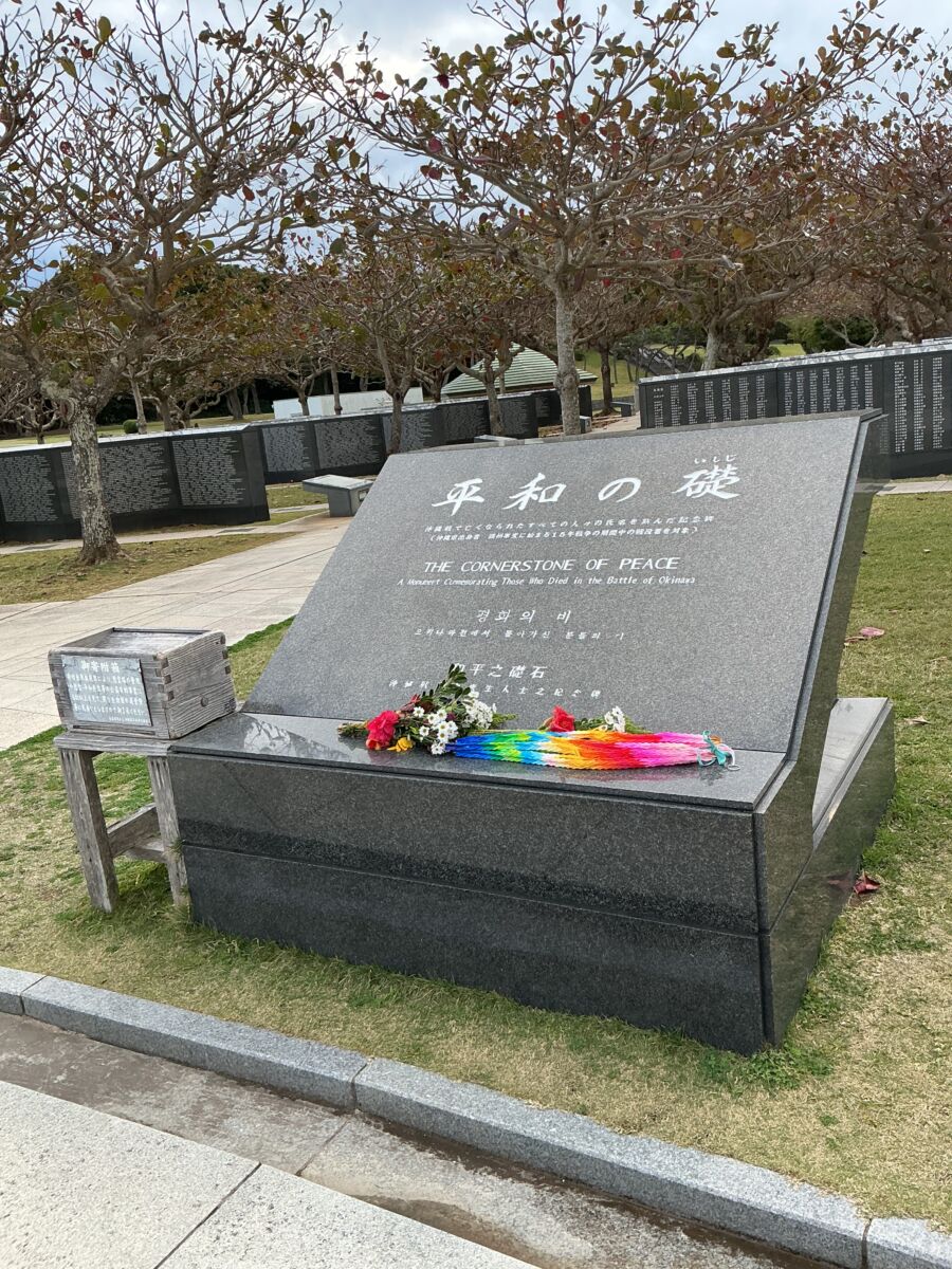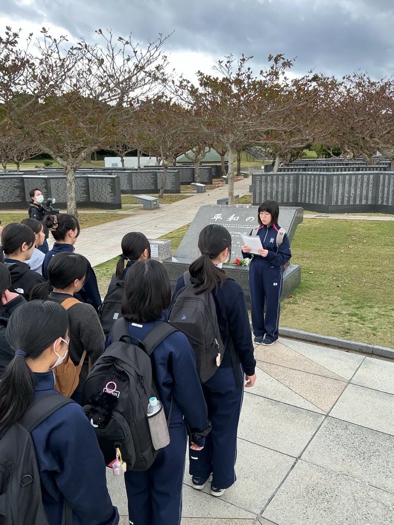 午後、糸数壕ではガマ(洞窟)の中に入り、その狭さと暗さを実感し改めて沖縄戦の悲惨さを体感しました。また、摩文仁の丘にある沖縄県平和祈念資料館と平和の礎を訪れ、資料館見学後、生徒たちによる平和の祈りを捧げました。平和の礎に記された戦没者の方々の、戦争のない世界や平和への願いに思いをはせながら命の尊さを再認識しました。