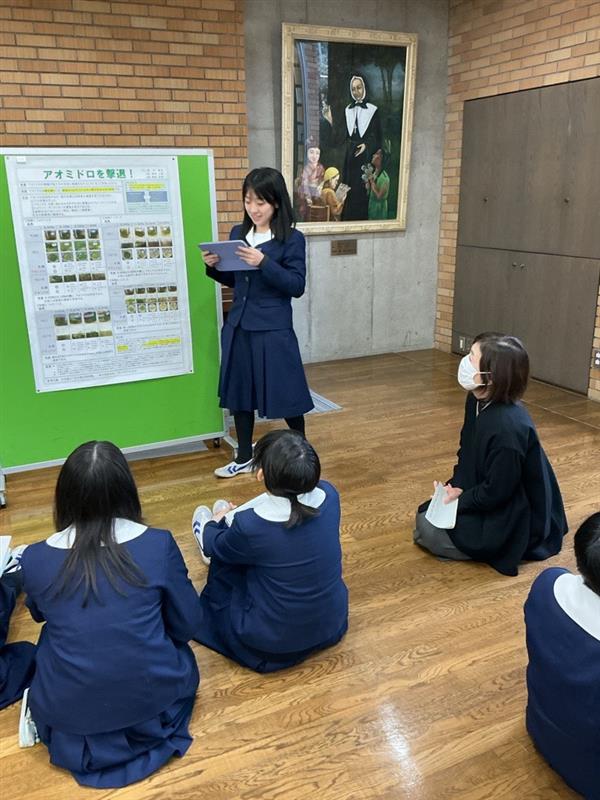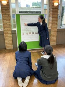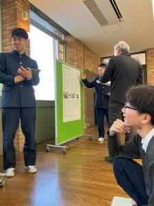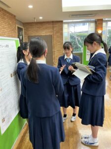 まず授業前黙想で緊張を和らげ、各班発表の最終打ち合わせを行いました。その後、発表者と傍聴者に分かれ、発表5分間+質疑応答2分間で進行されました。これまでの研究の成果を、熱をもってわかりやすく説明する姿に、聞く側も真剣に聞き入っていました。保護者の方々も、お忙しい中足を運んでくださりありがとうございました。審査により選ばれた班が講堂で発表を行う予定です。
