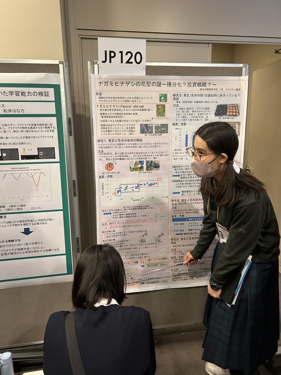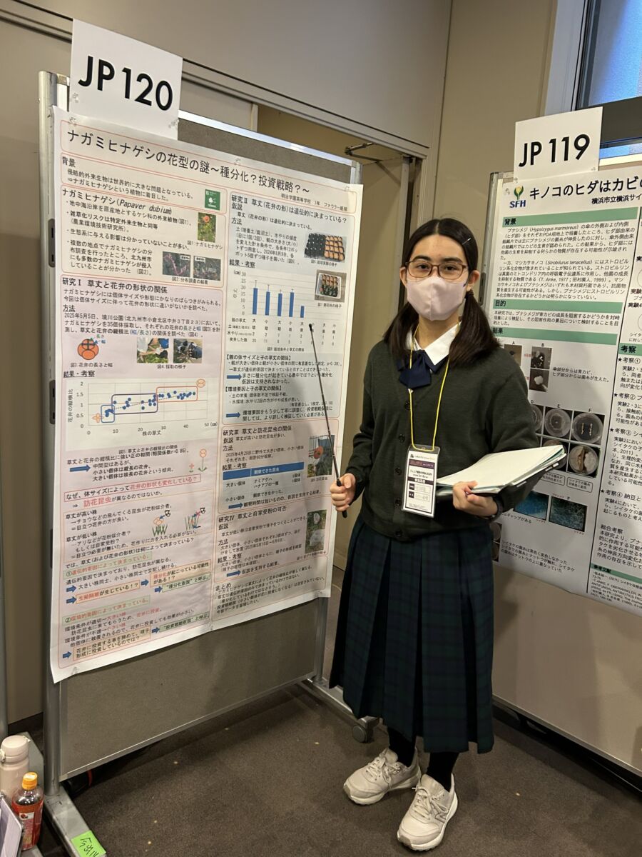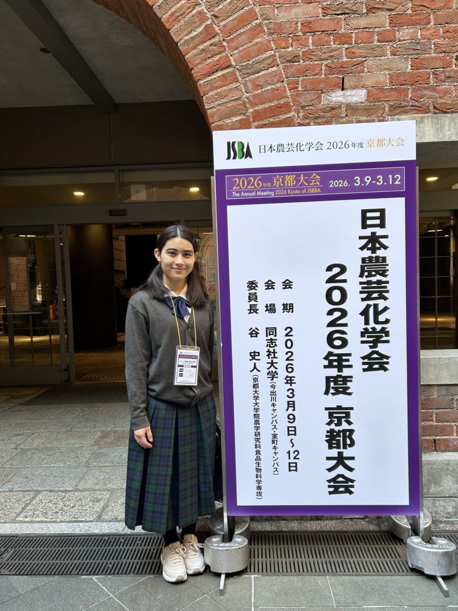 3月12日(水)、自然科学部高校1年生ファウラー姫瑠さんが、同志社大学で行われたジュニア農芸化学会2026に参加しました。この大会は日本農芸化学会2026年度大会の高校生による発表会であり、全国から集まった大学教員や研究者・大学院生などの前で高校生が研究成果を発表することができる貴重な機会です。そのような場所での発表の経験、そして、128件ものハイレベルな発表に接することができたことは、今後の大きな糧となることでしょう。