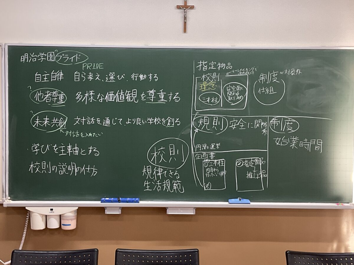 校則の理念として「明治学園プライド(PRIDE)」を掲げ、自主自律・他者尊重・未来共創の三本柱を軸に整理を進めています。単に「守る・守らせる」校則ではなく、生徒自身が考え、対話を通してよりよい学校を創っていくことを大切にします。校則・規則・制度を整理し、安全面に関わる取り決めは残しつつ、それ以外は理念をもとに毎年見直していく方針です。今後も自分たちの言葉で校則を考え続けていきます。