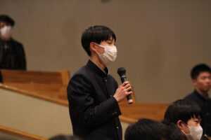 アカデミックメソッド発表会が学園講堂で開催されました。アカデミックメソッドは、学年の垣根を越えて学び合い、「自律した学習者」になるための探究活動で、1年次にはソーシャルスキル、2年次にはプレゼンテーションスキル、そして3年次にはアカデミックスキルを学びます。今回のテーマは、中1が「みんなの意見をまとめよう」、中2がSDGs12「つくる責任 つかう責任」、中3がSDGs13「気候変動に具体的な対策を」。各学年の代表班が、自分たちの特色を生かして熱のこもった発表を繰り広げ、客席の生徒達も真剣に聴き入っていました。そして、会の終わりに北九州市立大学の永末康介先生が、示唆に富んだ講評をしてくださいました。